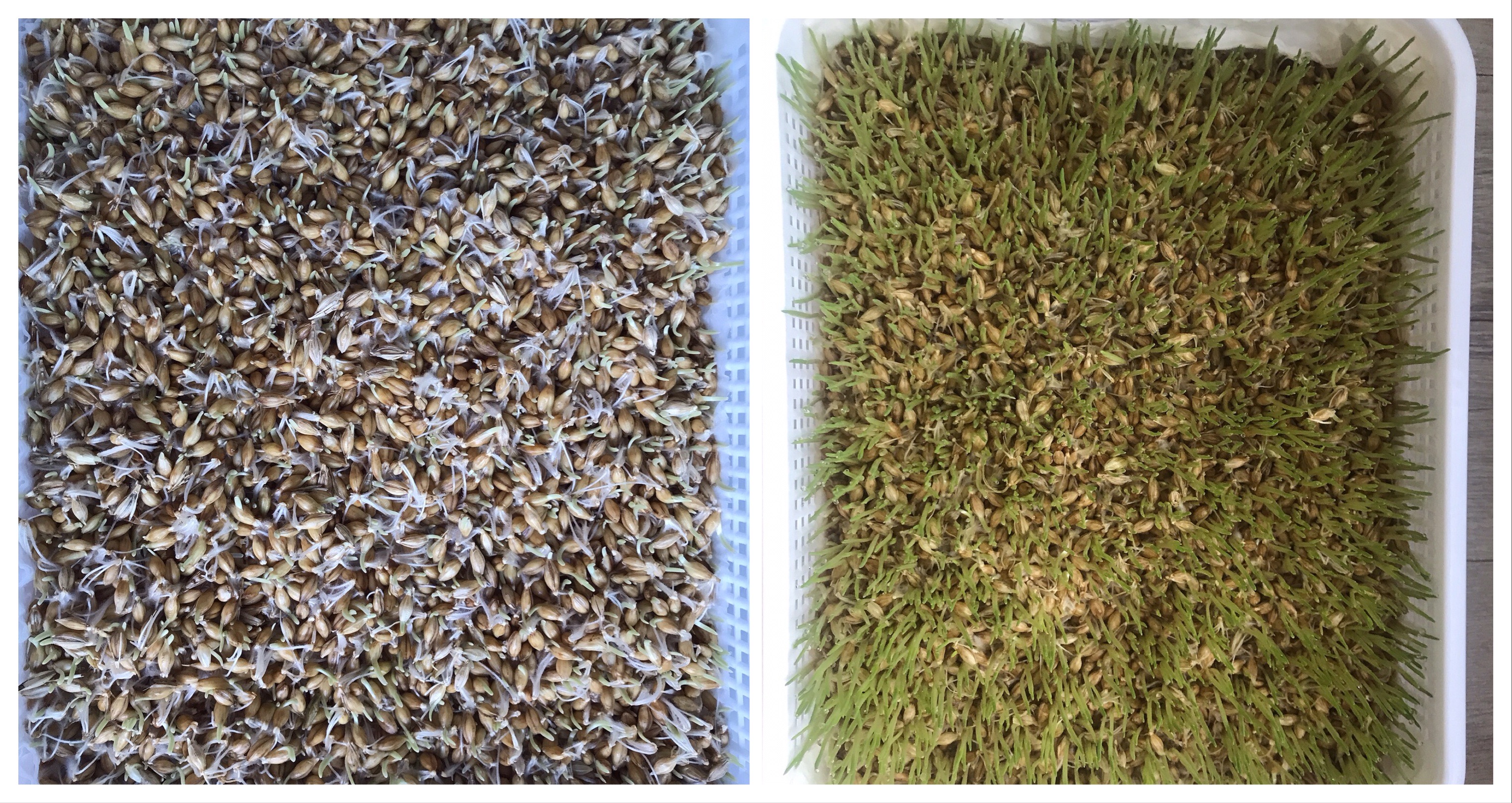# 싹이 나올 때까지 어두운 곳에 있다가 뿌리가 많이 나고 새싹보리가 나기 시작하면 밝은 곳에서 키우면 금방 자라요~