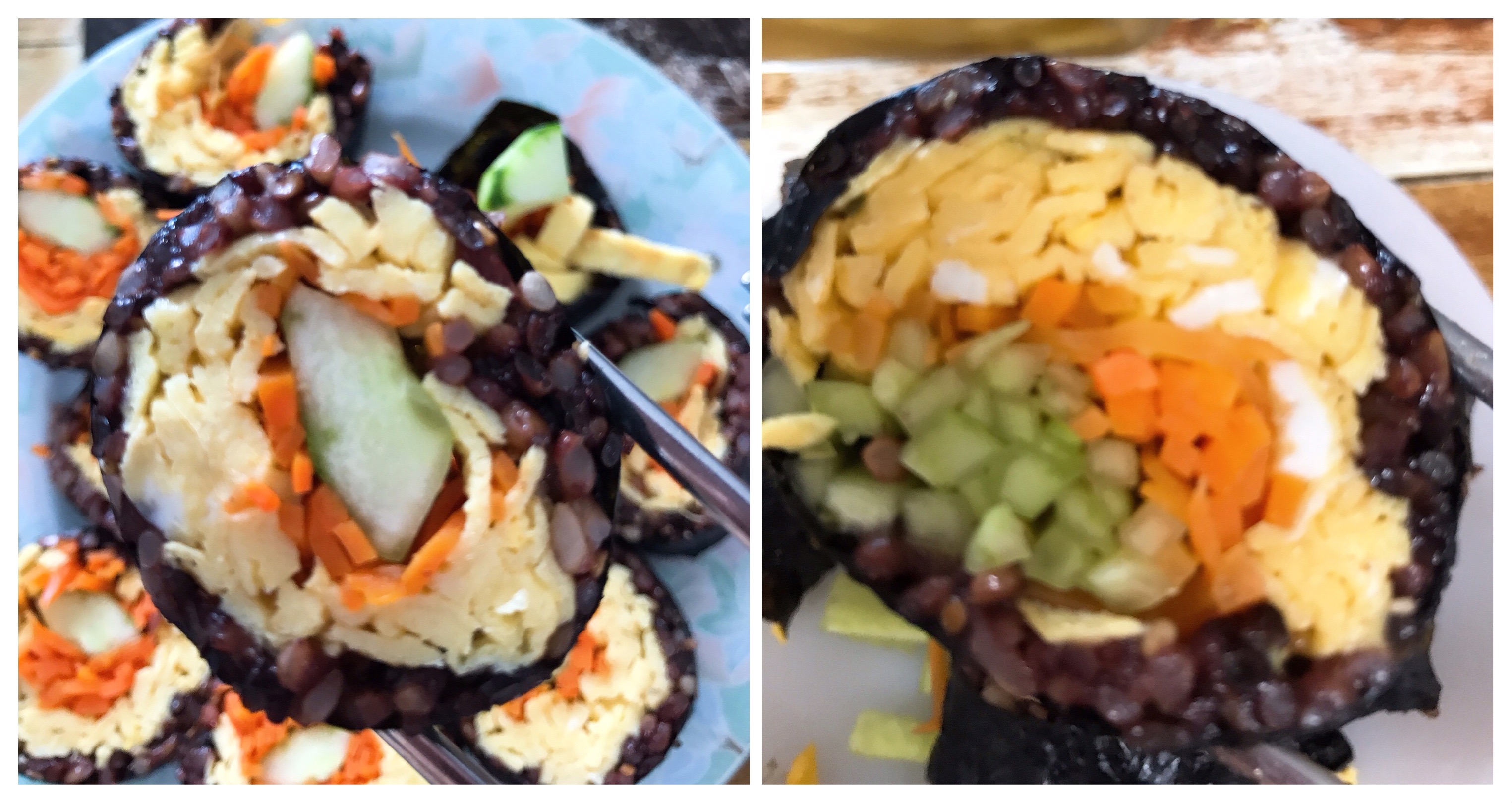 오이를 통으로 넣은 계란김밥과 채썬 오이로 만든 계란김밥입니다~