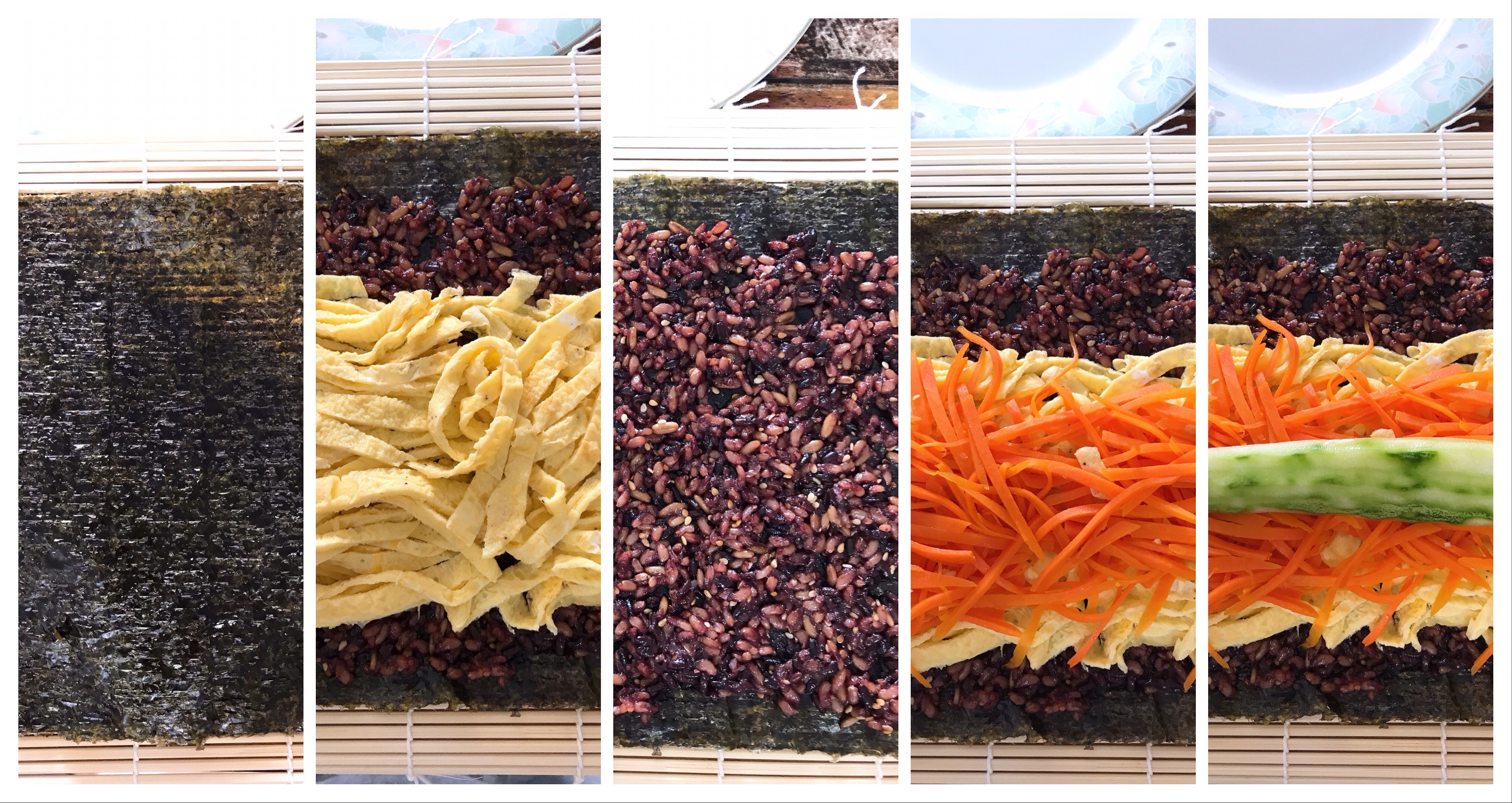 김 -> 밥 -> 채썬 계란지단 -> 채썬 볶은 당근 -> 절여진 오이 -> 말아주고 썰어줍니다~