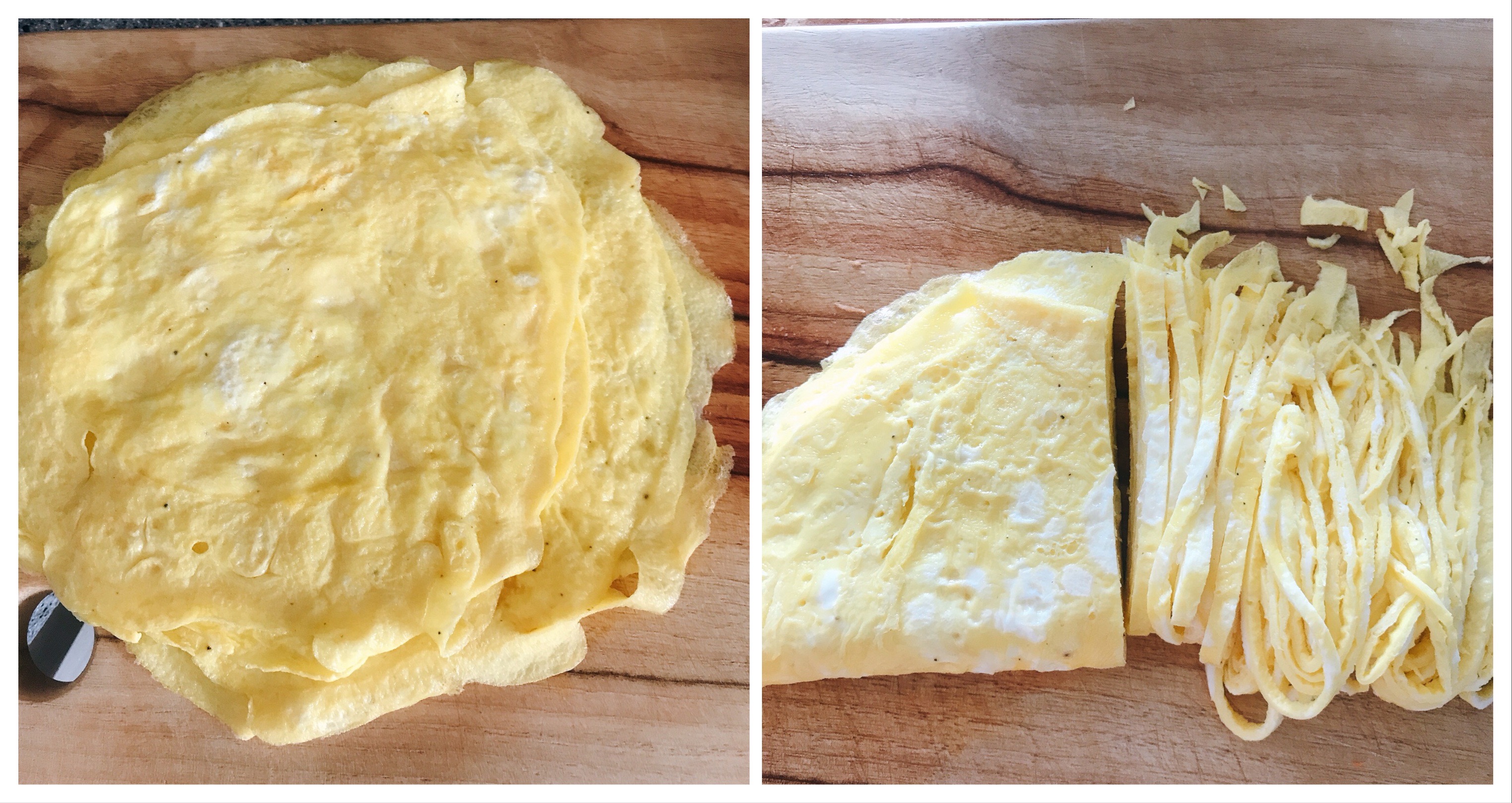 지단을 겹쳐서 반으로 접고 채 썰어주면 됩니다