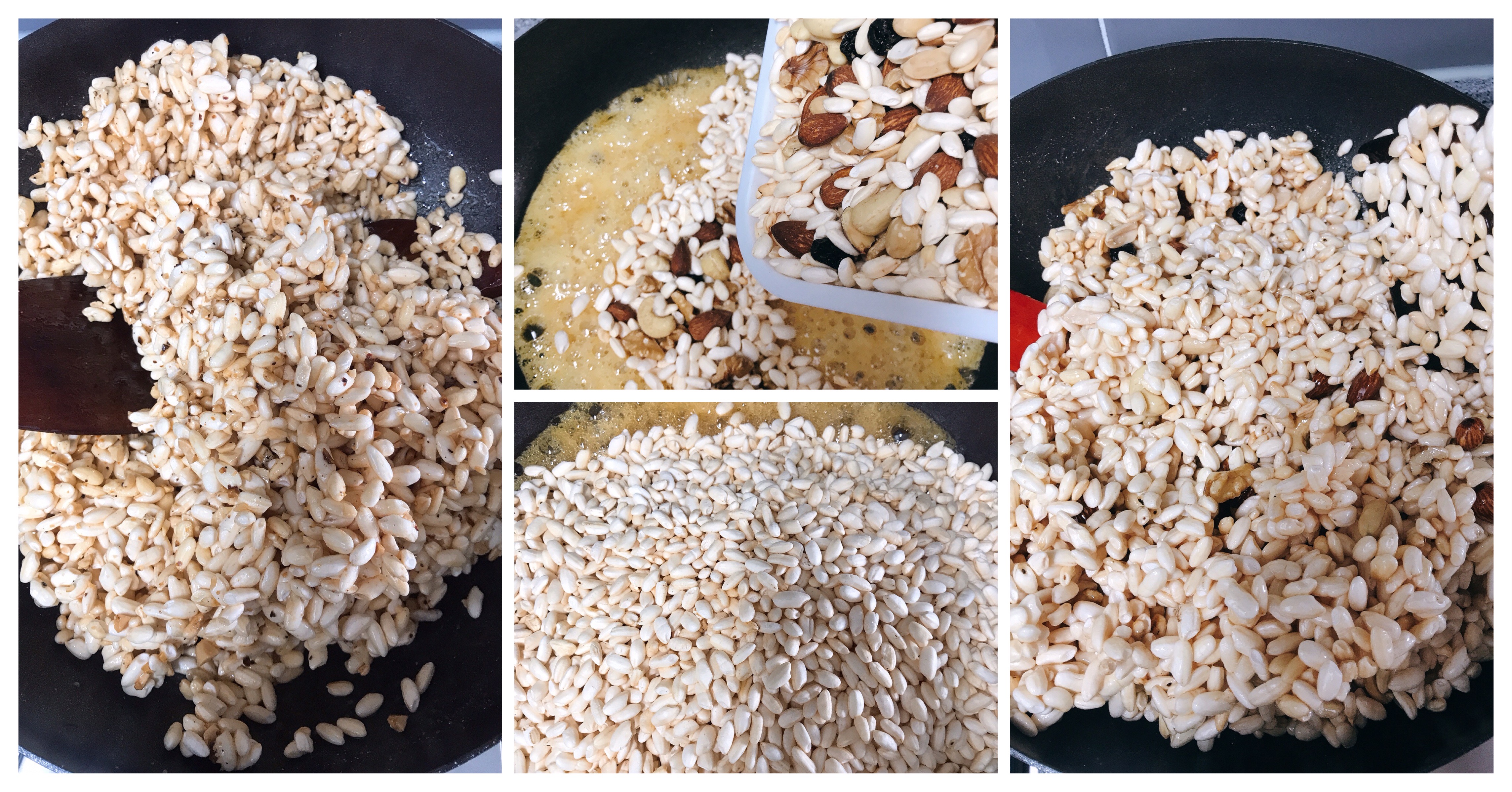 준비물 : 쌀튀밥 9컵, 조청 1컵 (조청:설탕=8:2), 견과류