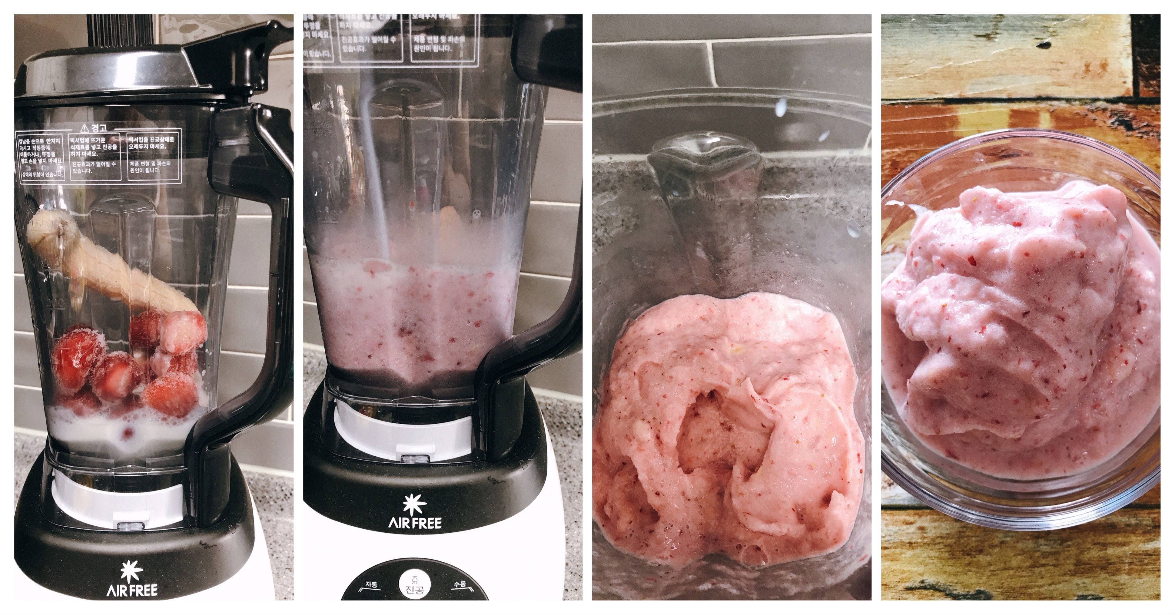 딸기는 초봄에 많이 구매해서 냉동실에 얼려서 딸기주스로 많이 먹다가 바나나도 얼려 놓기 때문에 같이 갈아서 먹는 딸바주스입니다~