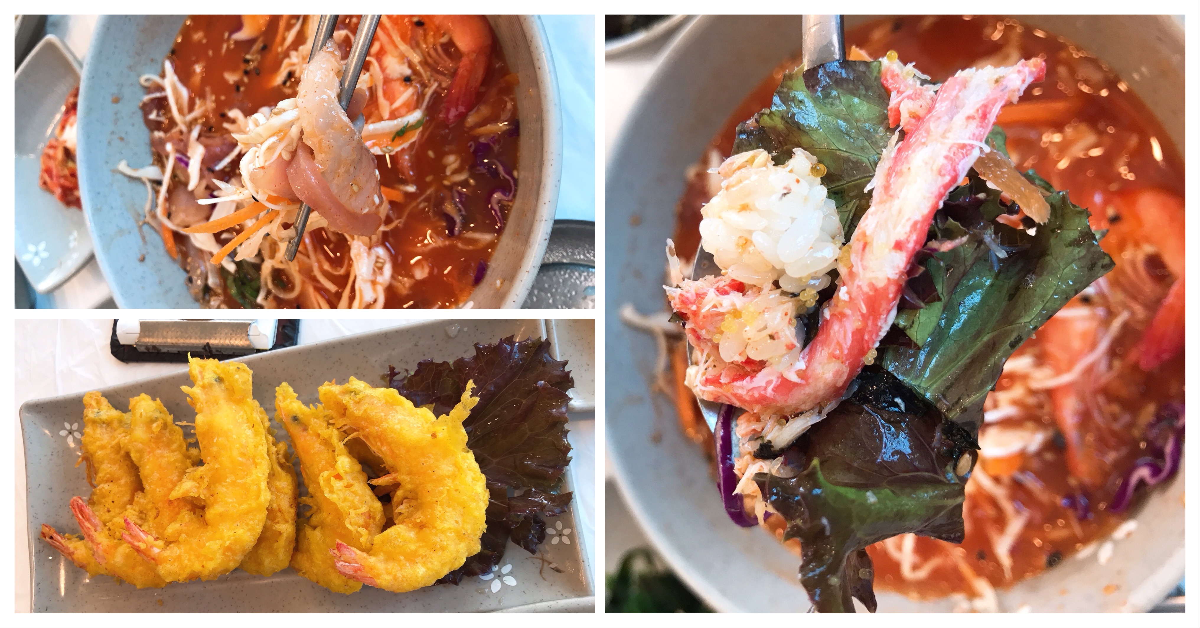 물회, 홍게비빔밥, 새우튀김을 시켰습니다~