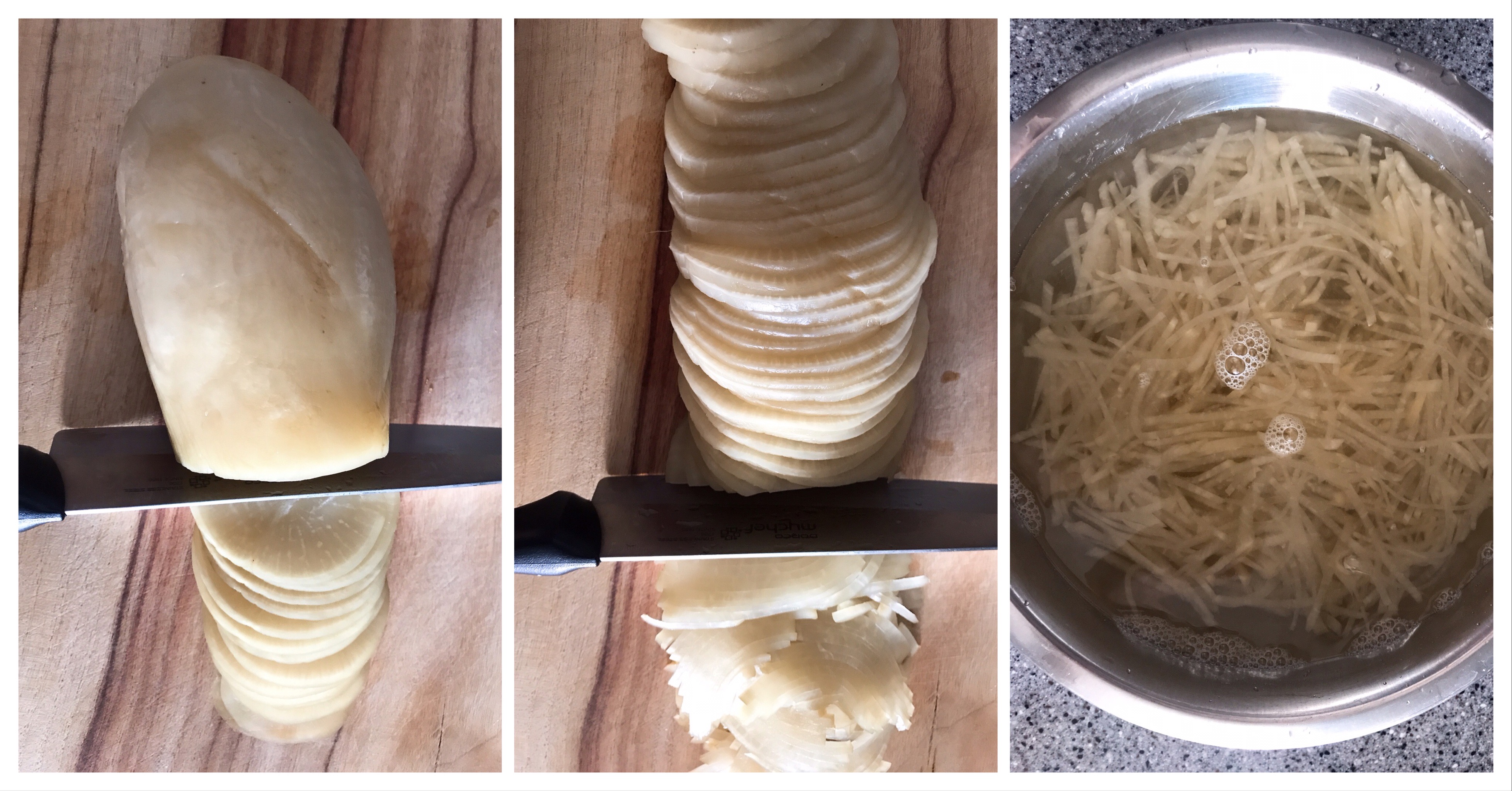 무짠지는 채썰어 물에 담겨 짠기를 빼줍니다~