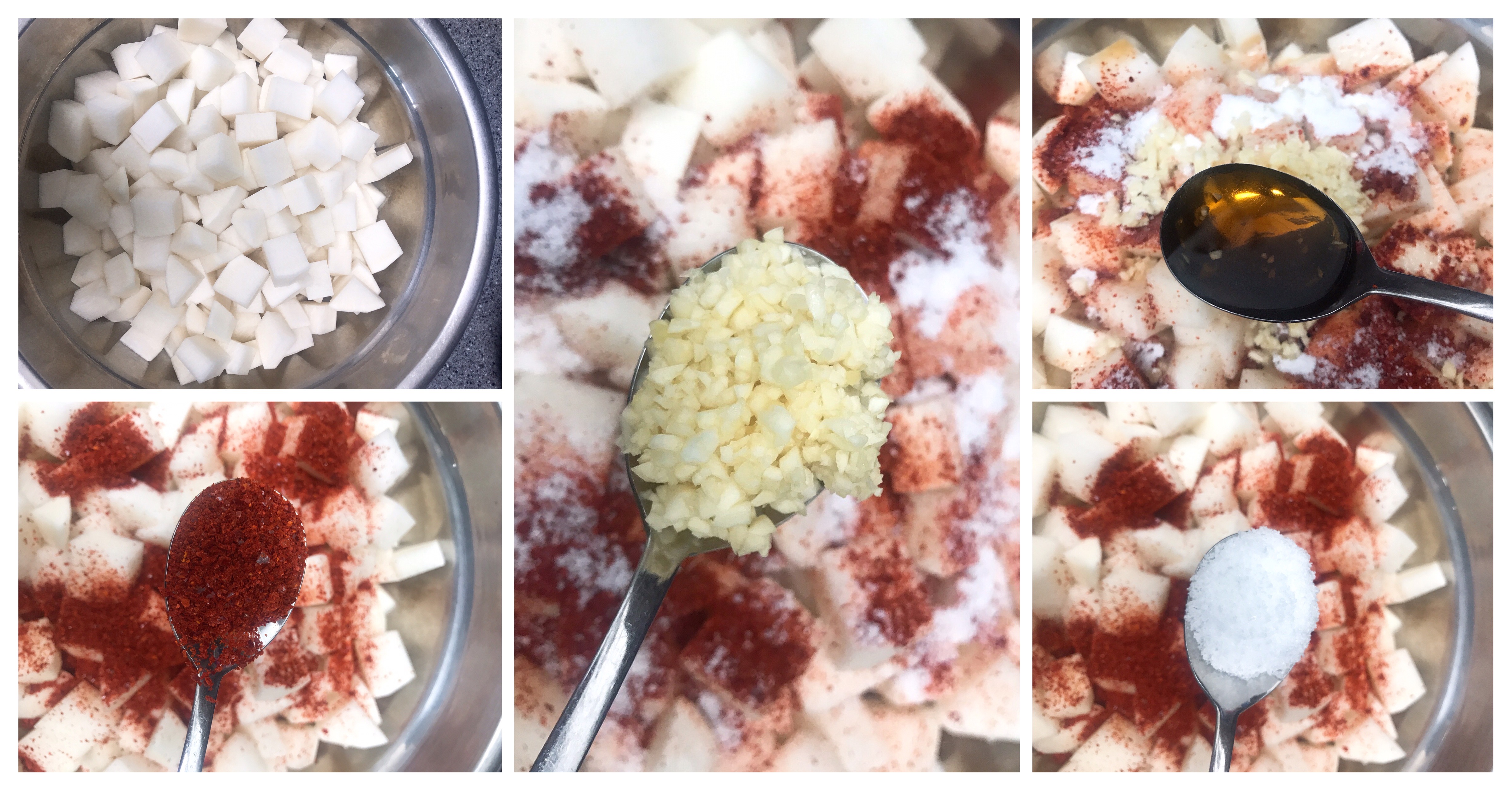 준비물 : 큰무 1개, 고추가루 4T, 소금 3T, 다진마늘 가득 1T, 설탕 3T, 멸치액젓 3T, 다진대파(1줄)