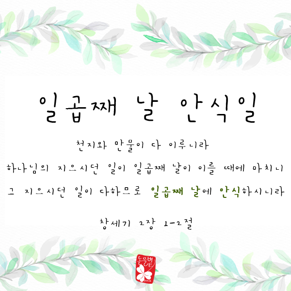 '안식일을 기억하여 거룩히 지키라'는 하나님의 말씀을 마음에 새기고 안식일을 더욱더 거룩히 지키는 우리가 되어야겠어요~
