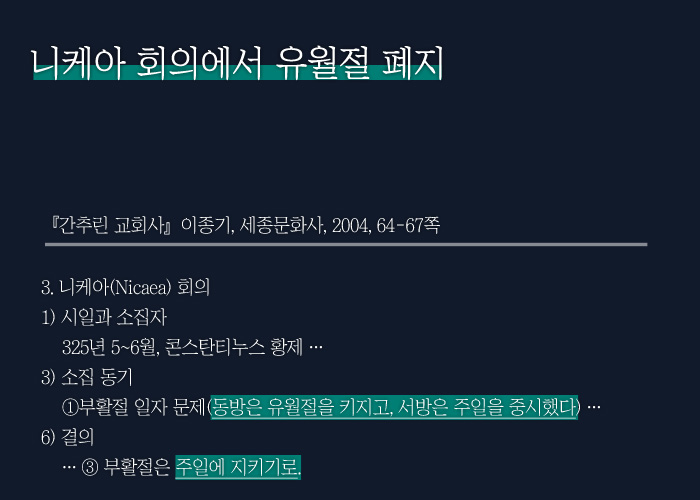2세기경 로마교회서는 그리스도의 죽으심을 기념하는 유월절 성찬식을 예수님께서 부활하신 일요일에 행해야 한다고 주장하다 A.D 325년 니케아 종교회의에서 로마교회가 주장해왔던 대로 성찬식을 일요일에 하기로 결정합니다.