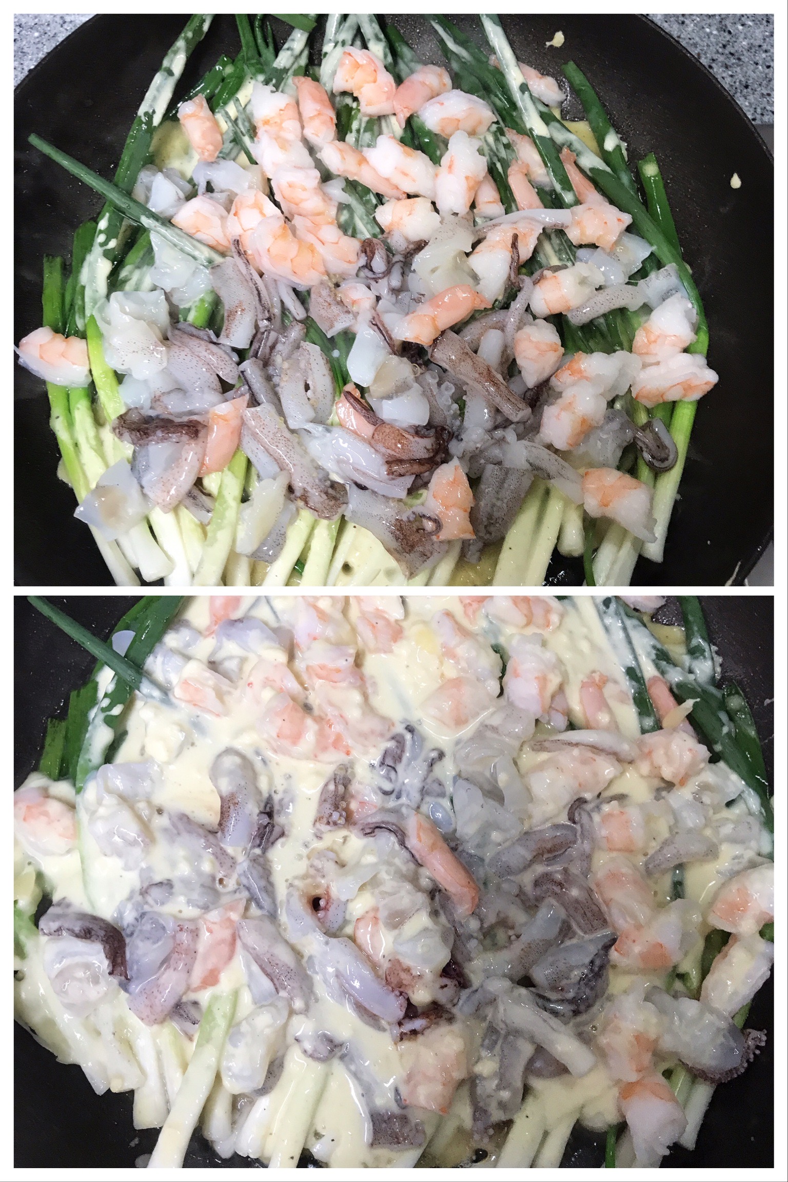 그 위에 자른 해물(새우와 오징어)을 듬뿍 넣어줬어요~