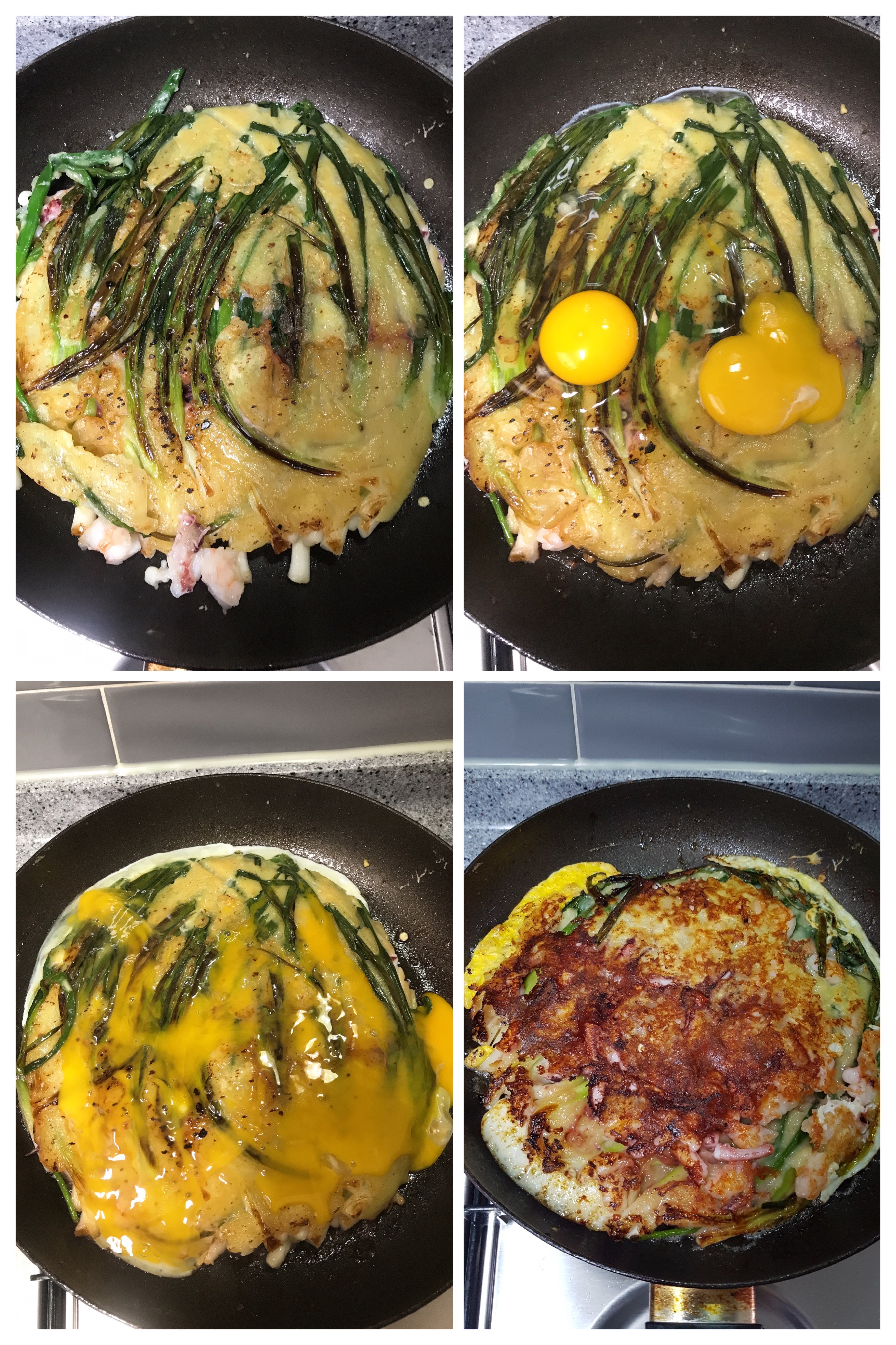 팬에 기름을 두르고 쪽파를 펼쳐주고 쪽파가 서로 붙을 수 있게 반죽물을 넣어 줍니다~