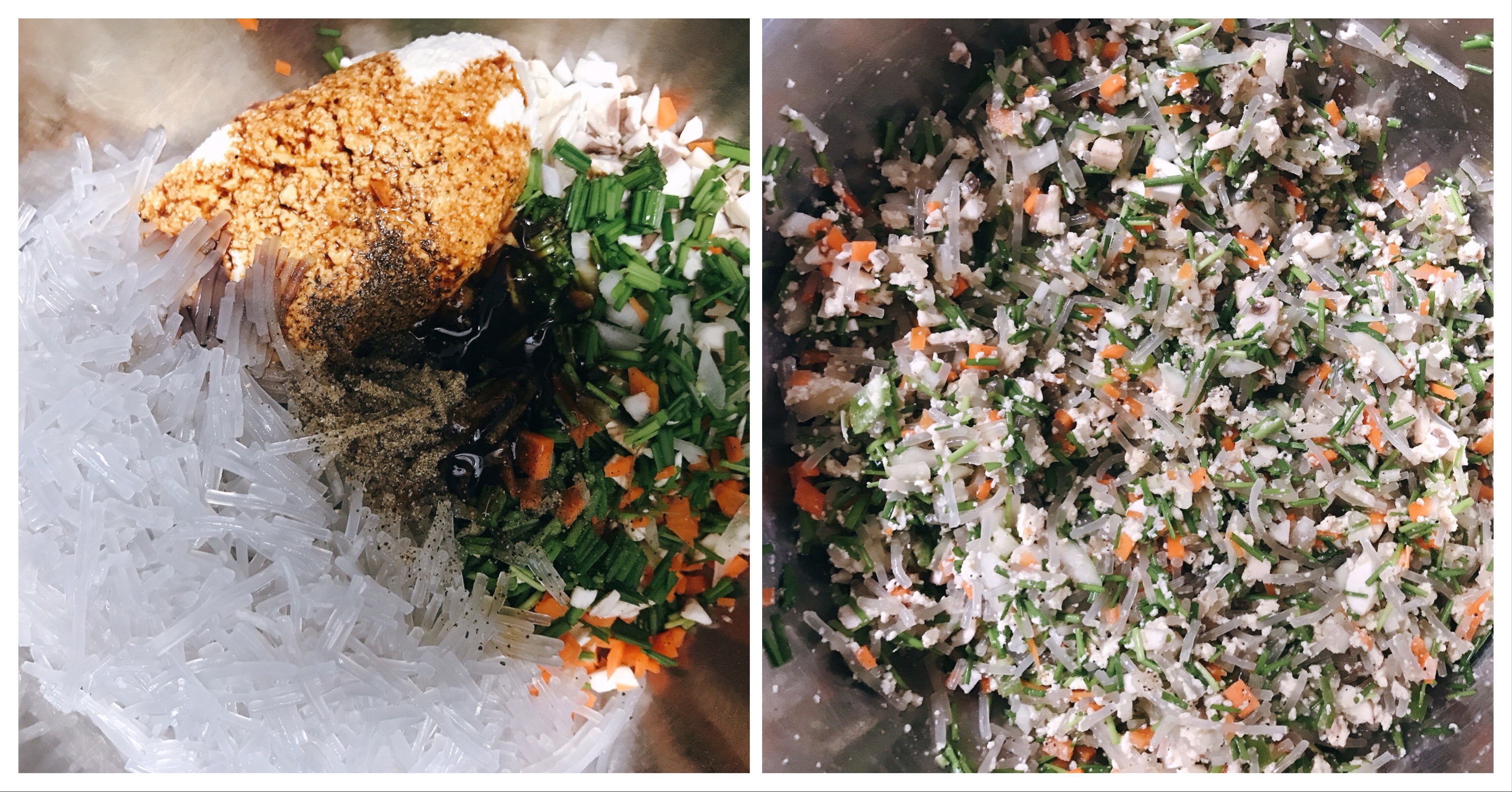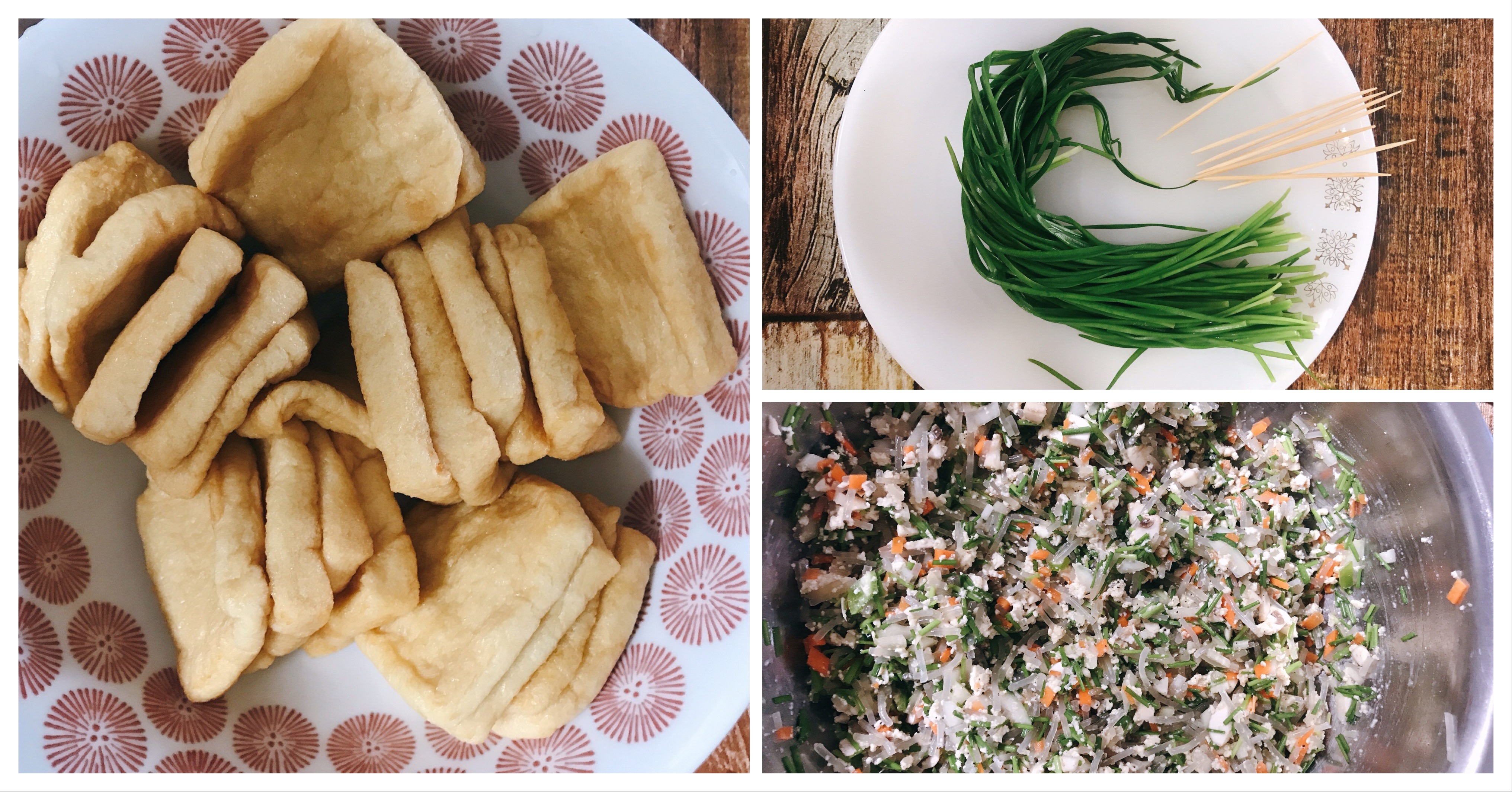 재료 : 냉동유부 다진야채들 당면 이쑤시개(미나리 또는 부추)
